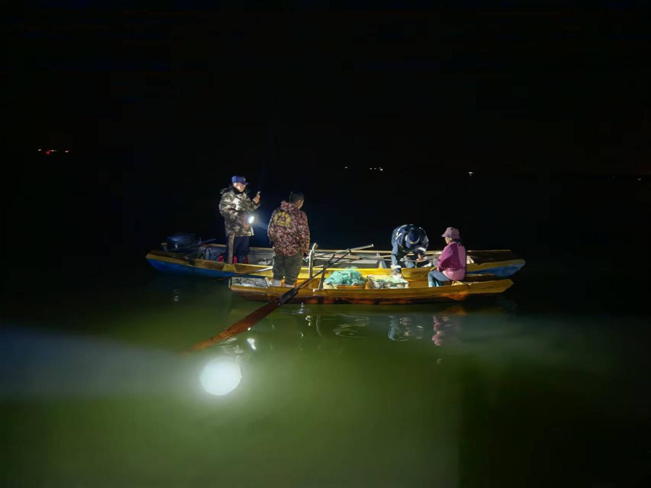 根据渔政监控平台线索及夜间跟踪监视情况,西凉湖综合管理执法大队执法人员在神山水域发现非法捕捞人员,根据事先安排,西凉湖综合管理执法大队安排3条执法船同时出击,采取闭灯驾船、降低发动机噪声等方法隐蔽接近目标,现场查扣非法捕捞船只2艘,非法捕捞涉案人员4名。在处置赤壁神山水域非法捕捞案后又收到渔政监控平台有关嘉鱼水域非法捕捞线索,执法人员顾不上深夜寒意和疲惫,直奔嘉鱼目标水域,查扣非法捕捞船只1艘,涉案人员弃船逃离现场。