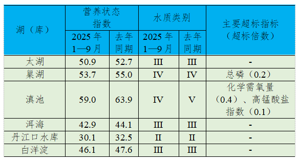 第三季度,监测的209个重点湖(库)中,水质优良(Ⅰ—Ⅲ类)湖库个数占比73.7%,同比上升6.4个百分点;劣Ⅴ类水质湖库个数占比4.8%,同比上升0.5个百分点。主要超标指标为总磷、化学需氧量和高锰酸盐指数。201个监测营养状态的湖(库)中,中度富营养的10个,占5.0%;轻度富营养的59个,占29.4%;其余湖(库)为中营养或贫营养状态。其中,太湖水质良好、轻度富营养;巢湖为轻度污染、轻度富营养,主要超标指标为总磷;滇池为中度污染、中度富营养,主要超标指标为化学需氧量、高锰酸盐指数和总磷;洱海水质良好、中营养;丹江口水库水质为优、贫营养;白洋淀为轻度污染、中营养,主要超标指标为溶解氧。